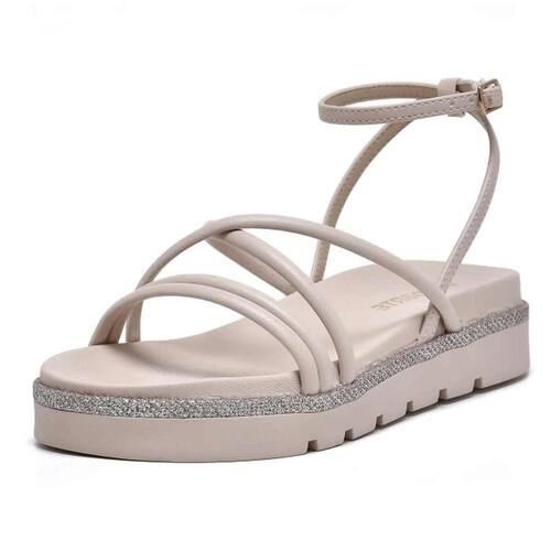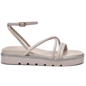 O modelo vem com solado flatform revestido por uma costura, a palmilha com formato anatômico garante conforto ao caminhar. Tramados de tiras acolchoadas e confortáveis envolvem os dedos e o peito do pé. O tornozelo é envolvido por uma tira que termina com fechamento em fivela.