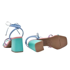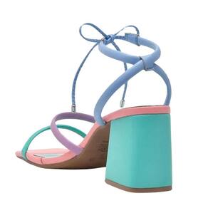 A Sandália Via Marte Salto Bloco Médio Feminina Amarração Multicolorida tem salto médio bloco e bico quadrado. No calcanhar as tiras se cruzam e passam em torno do tornozelo, finalizando em fechamento com amarração. Duas tiras confortáveis envolvem os dedos e o peito pé.