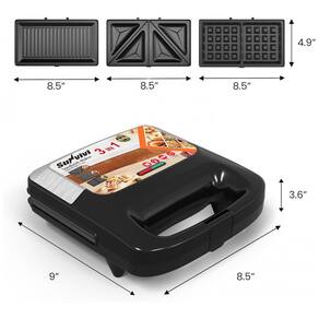 Sanduicheira elétrica 3 em 1 com 800W de potência. Inclui três placas removíveis antiaderentes para sanduíches, waffles e grelhados. Possui indicadores LED de funcionamento e preparo, alça de toque frio e trava de segurança. Corpo em aço inoxidável e placas antiaderentes facilitam a limpeza. Design compacto e leve. Compatível com uso doméstico.Funciona como grill