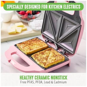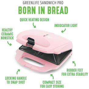 Sanduicheira Greenlife com placas de cerâmica antiaderente, design de aquecimento rápido, luz indicadora, alça de bloqueio e pés de borracha.Funciona como grill