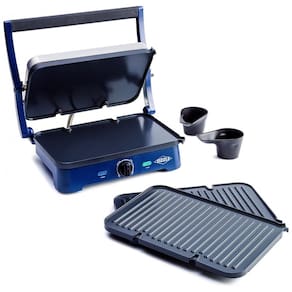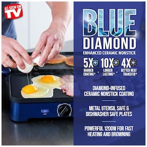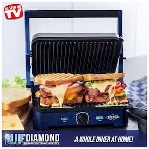 Sanduicheira antiaderente Blue Diamond com revestimento cerâmico, controle de temperatura, design lay-flat e prato superior ajustável. Compatível com lava-louças.