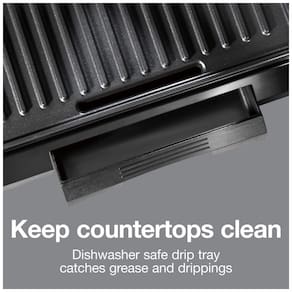 PANINI PRESS GRILL IN ONE Faça facilmente uma variedade de sanduíches prensados a quente de espessuras variadas, de queijo grelhado e Rubens a paninis e tortas mexicanas. Ou use a sanduicheira que economiza espaço para grelhar hambúrgueres, frango, legumes e muito mais. FÁCIL DE LIMPAR As placas de cerâmica antiaderentes duráveis nesta sanduicheira quente são simples de limpar. Basta limpá los com um pano úmido depois de esfriarem. ZENAMENTO COMPACTO E VERTICAL Uma trava da tampa na tampa mantém a grelha da prensa panini fechada entre os usos e facilita o zenamento na horizontal ou na vertical. MANTENHA BANCADAS LIMPAS A bandeja de gotejamento na grelha elétrica retém graxa e pingos para eliminar a bagunça. Quando terminar de cozinhar, basta deslizar para fora e colocá lo na máquina de lavar louça
