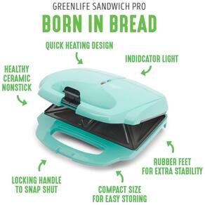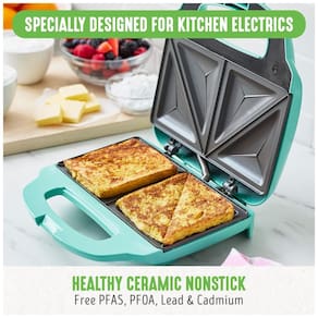Sanduicheira com revestimento antiaderente cerâmico, livre de PFAS, PFOA, chumbo e cádmio. Design de aquecimento rápido e alça de bloqueio para fácil armazenamento.Funciona como grill