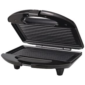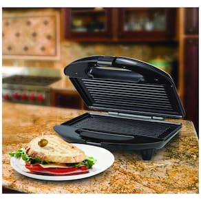 Nossa potente prensa panini de 750 W cozinha 1 a 2 sanduíches em minutos O aquecimento rápido e uniforme garante linhas de grelha perfeitas Sanduíches escorregam das placas antiaderentes A prensa Panini possui luzes indicadoras de energia e pré aquecimento Fácil de transportar, alça de travamento