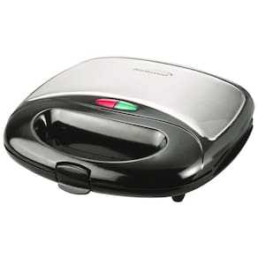 Sanduicheira Brentwood TS-246, 750W, 110V, com placas antiaderentes, luzes indicadoras de energia e pré-aquecimento, e alça de travamento.