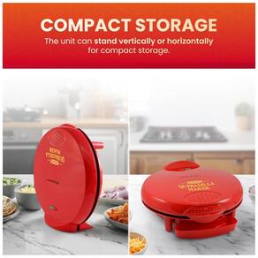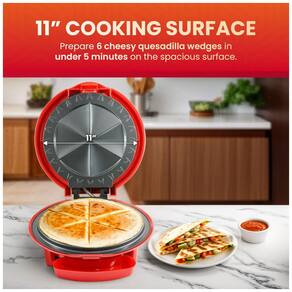SUPERFÍCIE DE COZEDURA DE Cozinhe 6 fatias de quesadilla na grande superfície de cozimento antiaderente de em pouco menos de 5 minutos. Lanches de queijo, derretidos e deliciosos LIMPEZA FÁCIL Quando terminar de fazer as quesadillas na placa quente antiaderente, simplesmente limpe a superfície de cozimento, não use produtos de limpeza abrasivos ZENAMENTO COMPACTO A unidade fica na vertical para um zenamento prático e arrumado depois de terminar de cozinhar ARO DE DRENAGEM E BANDEJA DE GOTEJAMENTO Retire todos os respingos da bandeja de gotejamento localizada embaixo da unidade. Reduza a gordura para um lanche saudável LUZES INDICADORAS Duas luzes indicadoras permitem que você saiba quando a unidade está ligada e quando a unidade está pré aquecida e pronta para cozinhar TRAVA DE TRAVAMENTO mantenha perfeitamente a quesadilla e o recheio intactos, ao mesmo tempo em que pontua e fatie 6 fatias