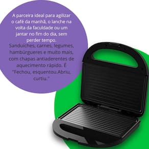 Palavras-chave: Sanduicheira Cadence SanduGrill SAN230: Agilidade e Sabor para Sua Cozinha Introdução: Transforme suas refeições com a Sanduicheira Cadence SanduGrill SAN230, a parceira perfeita para quem busca praticidade e sabor no dia a dia. Chega de perder tempo na cozinha Com ela, você prepara lanches e grelhados deliciosos em minutos, seguindo a filosofia Fechou, esquentou. Abriu, curtiu. Ideal para qualquer momento, do café da manhã ao jantar. Sobre a Cadence: Qualidade e Inovação para o Seu Lar: Há mais de duas décadas, a Cadence tem sido uma presença constante nos lares brasileiros, sinônimo de inovação, design e funcionalidade em eletroportáteis. Desde 1999, a marca se dedica a levar mais praticidade e alegria para as atividades diárias, conquistando a confiança dos consumidores com produtos de custo-benefício imbatível e alta performance. Escolher Cadence é investir em um dia a dia mais fácil e gostoso. Design Inteligente e Funcionalidades Essenciais: A Sanduicheira Cadence SanduGrill SAN230 foi projetada para oferecer uma experiência culinária superior, unindo desempenho e segurança: Chapas Antiaderentes de Alta Performance: Diga adeus aos alimentos grudados e à dificuldade na limpeza. As chapas com revestimento antiaderente garantem que seus sanduíches e grelhados sejam preparados sem aderência, facilitando o manuseio e tornando a limpeza rápida e simples. Aquecimento Potente e Rápido 750W : Equipada com 750W de potência, a sanduicheira atinge a temperatura ideal em poucos minutos. Isso significa mais agilidade no preparo, entregando sanduíches crocantes e dourados e grelhados no ponto certo em tempo recorde. Grelhamento Duplo e Uniforme: Com aquecimento simultâneo nas duas chapas, seus alimentos são grelhados por completo, de forma uniforme e eficiente, garantindo resultados saborosos e consistentes a cada uso. Segurança e Praticidade no Uso: A alça com trava assegura que a sanduicheira permaneça fechada durante o preparo, e as luzes indicadoras de funcionamento sinalizam quando o aparelho está ligado e pronto para uso. Além disso, os pés antiderrapantes garantem total estabilidade na bancada, e o porta-fio facilita o armazenamento, mantendo sua cozinha sempre organizada. Benefícios para o Seu Dia a Dia: Refeições Rápidas e Descomplicadas: Ganhe tempo precioso em sua rotina agitada, preparando lanches e refeições completas em instantes. Versatilidade Culinária: Prepare desde sanduíches quentinhos até pequenos cortes de carne, legumes e hambúrgueres, explorando diversas possibilidades com um único aparelho. Limpeza Sem Esforço: A tecnologia antiaderente das chapas torna a limpeza uma tarefa rápida e prática, liberando mais tempo para você. Compacta e Fácil de Guardar: Seu design otimizado permite que ela se adapte a qualquer espaço na cozinha, mesmo em ambientes menores, e o porta-fio ajuda a manter tudo arrumado. Confiabilidade da Marca: Conte com a qualidade e a de um produto Cadence, desenvolvido para durar e facilitar sua vida. Conclusão: A Sanduicheira Cadence SanduGrill SAN230 é o eletrodoméstico que faltava na sua cozinha para unir agilidade, sabor e conveniência. Seja qual for a voltagem da sua residência disponível em 110V e 220V , este aparelho é a escolha ideal para quem busca otimizar o tempo sem abrir mão de refeições deliciosas. Adquira já a sua e transforme a forma como você se alimenta Ficha Técnica Completa: Modelo: SAN230 Disponível em SAN230-127 para 110V e SAN230-220 para 220V Marca: Cadence Potência: 750