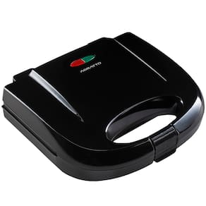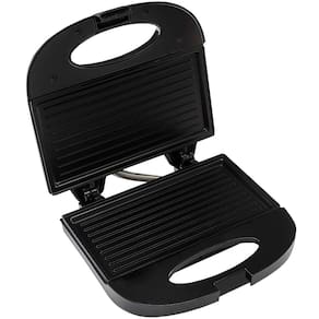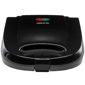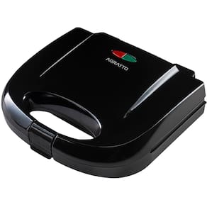 Sanduicheira e grill Agratto 750W com placas antiaderentes, lâmpada piloto, alça com trava e base porta fios. Ideal para lanches e grelhados rápidos.Funciona como grill