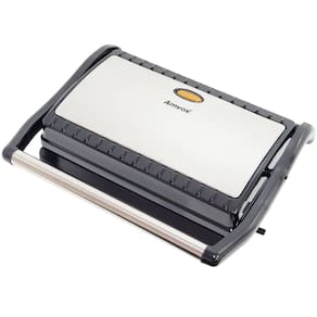 Sanduicheira e grill Amvox AMS 800 com chapas antiaderentes, alça com trava, proteção contra superaquecimento, e pés antiderrapantes. Ideal para preparar lanches e grelhados.Funciona como grill