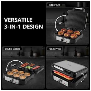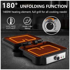 Esta churrasqueira elétrica 3 em 1 é uma máquina versátil e eficiente. Com duas grandes placas de cozimento de 27 x 22 centímetros, é possível grelhar bifes, sanduíches, paninis, vegetais e muito mais para qualquer necessidade de grelhar em ambientes internos. Com uma potência de 1400 watts e tecnologia de aquecimento dupla face, você pode preparar comida deliciosa rapidamente. O controle termostático da grelha de prensa permite ajustar a temperatura da grelha entre 210C a 250C dependendo dos requisitos de cozimento de diferentes alimentos. A luz vermelha é o indicador de energia e a luz verde é o indicador de pré aquecimento. Quando a churrasqueira Panini estiver conectada à fonte de alimentação, ambas as luzes acenderão ao mesmo tempo. A luz verde acenderá quando a temperatura definida for atingida. Com um dreno de gordura e um copo coletor, há um canal de drenagem de gordura entre as placas duplas para que o copo coletor retenha o excesso de gordura e resíduos de alimentos, tornando os alimentos mais saudáveis e a limpeza mais fácil. A placa antiaderente feita de alumínio de qualidade alimentar garante um uso confiável, liberando os alimentos rapidamente e permitindo uma limpeza rápida e fácil sem esforço. O tamanho compacto de apenas 32, x 31, x 12, ocupa muito pouco espaço no balcão ou armário, tornando sua churrasqueira fácil de armazenar. As alças de toque frio e pés antiderrapantes mantêm vocêdurante o uso.