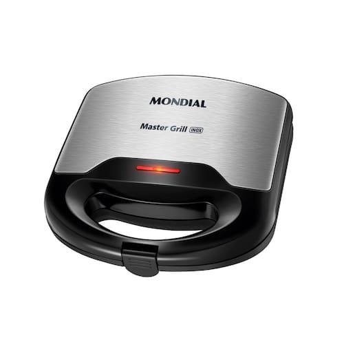Sanduicheira e Grill Mondial Master 2 em 1 com 750W de potência, detalhes em aço inoxidável, trava de fechamento, alça isotérmica, lâmpada piloto e controle de temperatura automático. Ideal para preparar sanduíches, carnes, peixes, frango e legumes.Funciona como grill