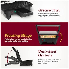 GRILL PRESS Com fome de um sanduíche Com o Panini Press Grill Elite Cuisine, você obtém dois aparelhos em um. O design da dobradiça se ajusta para permitir que você use como uma grelha interna plana de 180 ou uma prensa de sanduíche de panini de pão crocante com apenas um toque de botão RÁPIDO E COMPACTO Refeições rápidas e saborosas são fáceis de preparar. Perfeito para fazer um lanche rápido, sanduíches para o almoço ou grelhar o jantar. O tamanho compacto ocupa pouco espaço no balcão ou na prateleira, facilitando o zenamento de sua grade de contato. LIMPEZA FÁCIL O design inclinável e os pés resistentes a derrapagem garantem que o Press Grill permaneça sempre na posição. As placas de cozimento antiaderentes e o design inclinado garantem que a gordura de cozimento seja drenada para trás para facilitar a limpeza. Basta remover a bandeja de gotejamento para uma limpeza sem esforço O antiaderente PFOA FREE libera rapidamente os alimentos para uma limpeza rápida e fácil sem complicações Marca: Não Informado