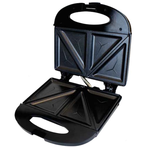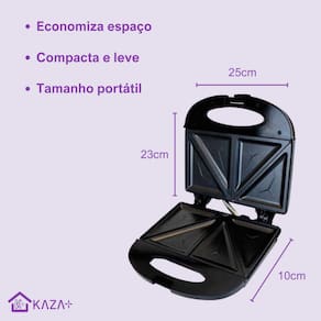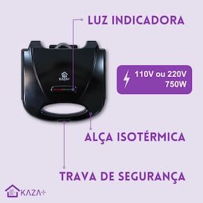 Sanduicheira Kaza+ com potência de 750W, luzes indicadoras, alça com trava de segurança, base antiderrapante e superfície antiaderente.Funciona como grill