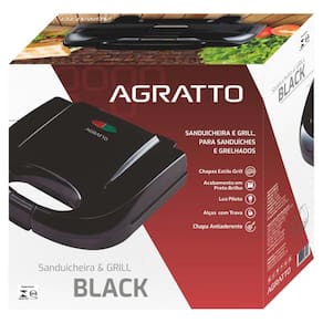 Sanduicheira e grill. Voce pode preparar vários tipos de sanduiches ou mesmo grelhar carnes leves. As chapas possuem camadas antiaderente. Facilitando na hora de retirar os alimentos e limpar.- Sanduíches deliciosos com muita praticidade.- Saboreie lanches deliciosos e saudáveis com praticidade e rapidez.- A Sanduicheira AGRATTO é perfeita para preparar aquele lanche ou um bom grelhado, tudo com muita praticidade.- É fácil de usar, é fácil de limpar.- Chapas estilo grillVocê pode preparar vários tipos de sanduíches, ou mesmo grelhar carnes leves.- Luz piloto- As luzes indicam quando a sanduicheira está ligada ou em aquecimento.- Fácil de limpar- As chapas possuem camada antiaderente, facilitando na hora de retirar os alimentos e da limpeza.- Black Piano- Cor com acabamento em black piano.• Sanduicheira e grill• Chapas estilo grill• Chapa antiaderente• Alça com trava• Luz de funcionamento