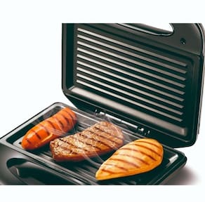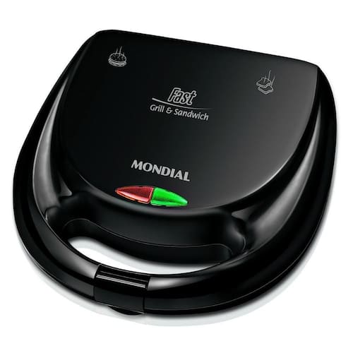 Sanduicheira Fast Grill Mondial, 750W, chapas antiaderentes, trava de fechamento e alça fria.Funciona como grill