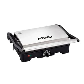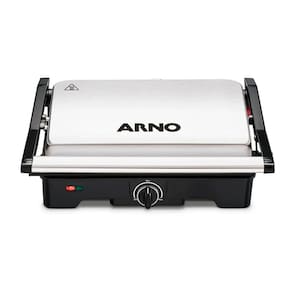 Grill e Sanduicheira Arno Dual Inox com abertura 180º, 1100W de potência e placas antiaderentes onduladas.Termostato regulável