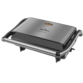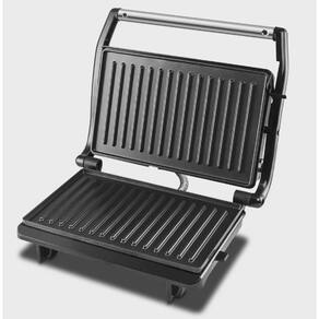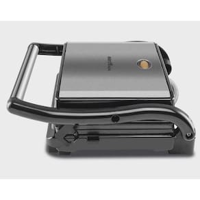 Especificações: Faz carnes, peixes e vegetais; Funciona como grill e sanduicheira; Faz dois sanduíches de uma vez; Placas com revestimento antiaderente; Possui placa lisa (inferior) e placa grill (superior); Luz indicadora de funcionamento; Potencia de 800W / 127V Base antiderrapante; Pegador com toque a frio; Trava para armazenamento; Acabamento em Aço Inox; Dimensões da placa de aquecimento: 22,5cm X 14 cm; Composição: Metal e Plástico;