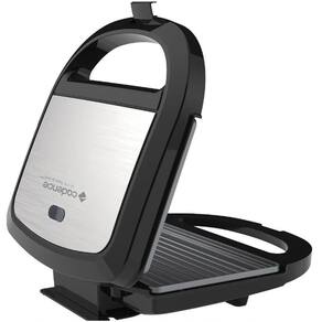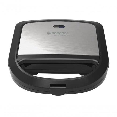 Sanduicheira Grill Elétrica Cadence Black Inox 750W com chapas antiaderentes, aquecimento em ambos os lados e indicadores luminosos.Funciona como grill
