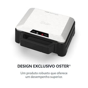 Design exclusivo Oster com acabamento premium em inox escovado. Chapas internas com base lisa e profunda para aquecimento uniforme e chapa superior estriada com marcas de grelha. Botão On/Off Soft Touch com indicadores luminosos. Alça com toque frio e fecho robusto. Chapas com tripla camada antiaderente. Permite preparar mais de um sanduíche por vez.Funciona como grill