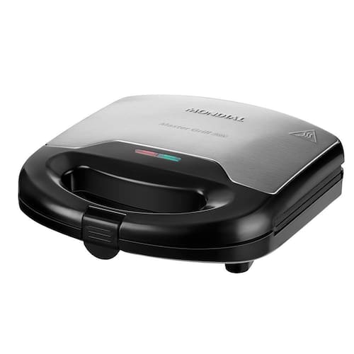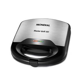 Sanduicheira Mondial Inox com grelha dupla antiaderente, 850W de potência, lâmpadas-piloto e trava dFunciona como grill