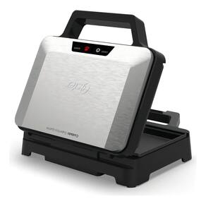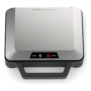 Design exclusivo Oster, 1000W de potência, chapa inferior profunda com tripla camada antiaderente, indicadores luminosos, alça com toque frio, fecho grande e robusto, chapa superior estriada, acabamento em aço inox escovado.Permite ejeção manual