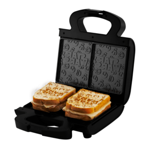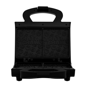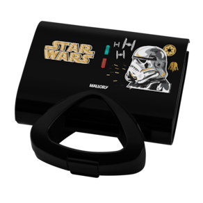 Sanduicheira Mallory Star Wars com placas antiaderentes que estampam o sanduíche, 750W, luzes indicadoras, alça com toque frio, trava de segurança e pés antiaderentes.Funciona como grill