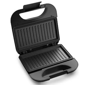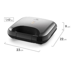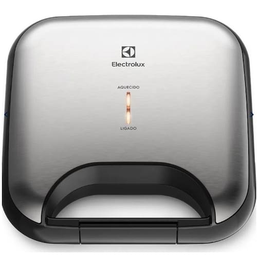 Sanduicheira e grill Electrolux com 750W, aquecimento rápido, placas antiaderentes, alça com isolamento térmico, trava de fechamento, armazenamento vertical e enrolador de cabo.Funciona como grill