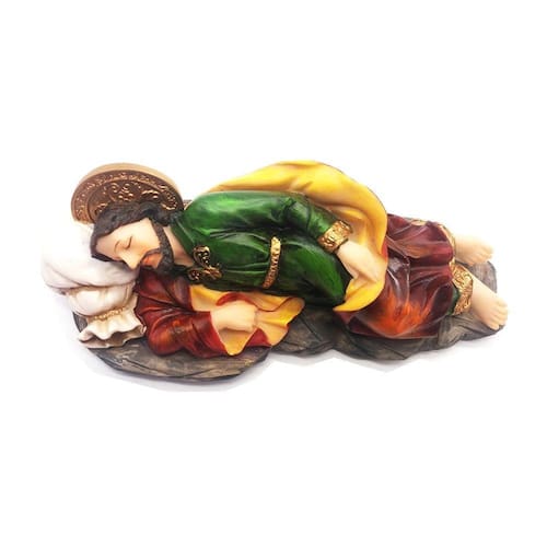 - Imagem São Jose Dormindo. - Resina alta qualidade. - Pintura a mão. - Acabamento rico em detalhes. - Comprimento: 22 cm. - Largura: 10 cm. - Altura: 7 cm