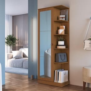 Sua estrutura em MDP de alta qualidade oferece resistência e estabilidade, enquanto as prateleiras internas e externas garantem excelente organização para calçados, acessórios, produtos de limpeza ou itens diversos. A porta com espelho de corpo inteiro agrega sofisticação e funcionalidade ao móvel, otimizando ainda mais o espaço.