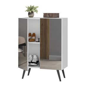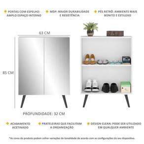 A Sapateira 2 Portas Retrô com Espelho Nina Multimóveis é produzida em MDP com acabamento acetinado (cerca de 20% de brilho), que garante maior durabilidade, facilidade na limpeza, além de um acabamento superior. Com 2 portas, possui um excelente espaço interno para acomodar seus sapatos e demais pertences (a prateleira interna suporta 8 Kg e o tampo 9 Kg). Os pés retrô, em polipropileno, dão um charme especial ao móvel deixando-o com um visual leve e permitindo você compor um ambiente com ar vintage e moderno ao mesmo tempo. Os espelhos nas portas deixam o móvel mais requintado, criando um ambiente moderno e charmoso. Os espelhos são de vidro (o que evita que a imagem fique distorcida) e lapidados, ou seja, passam por um processo para que as bordas não fiquem cortantes, o que garante maior segurança. Compacta, é uma excelente opção para otimizar seu ambiente, para que você possa aproveitá-lo da melhor maneira possível.