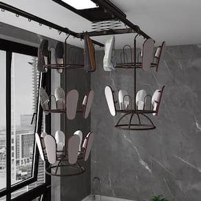 Possui um exclusivo gancho que o transforma em cabide, podendo ser utilizado como secador de sapatos ou mesmo como sapateira suspensa.