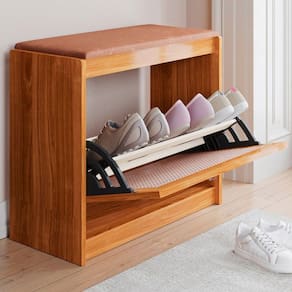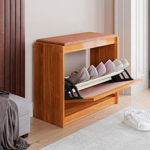 Organize a entrada da casa com a sapateira banco estofado Carisma Porta em Ratan, ideal para acomodar calçados e oferecer assento extra. Com porta basculante e prateleira interna, ajuda a manter até 6 pares de sapatos bem organizados e fora da vista. A estrutura em madeira maciça com acabamento em verniz PU e detalhe em ratan na porta traz resistência e um visual rústico aconchegante. O assento estofado com espuma D14 suporta até 120 kg, proporcionando conforto ao calçar ou retirar os sapatos em halls, quartos ou salas. Fabricada em madeira reflorestada, combina praticidade no dia a dia com um design que valoriza diferentes ambientes da casa.