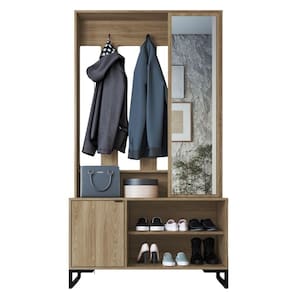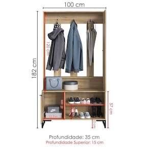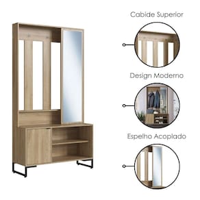 Sapateira P1067 moderna e perfeita para organizar sapatos, casacos e acessórios com praticidade. Conta com estrutura em MDP 15 mm (acabamento FF - Finish Foil) e pés em metal de 20 mm (pintura epóxi). Modelo multifuncional, composto por porta inferior com puxador em metal, nichos inferiores para calçados (para até 3 pares cada), ganchos superiores em metal e portal lateral superior com espelho (3 mm), ideal para halls, salas e quartos! Produto será entregue em 01 volume.