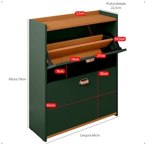 Fabricada em MDP de alta qualidade, oferece resistência e durabilidade. Conta com duas gavetas basculantes com prateleiras, ideais para armazenar até 12 pares de calçados, mantendo tudo organizado e harmonioso.