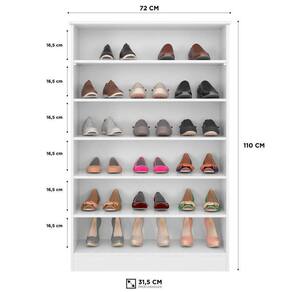 A sapateira oferece um amplo espaço interno com 6 prateleiras, sendo 4 delas com regulagem de altura, permitindo que você acomode diferentes tamanhos de calçados, desde sapatos baixos até botas de cano alto. Para garantir segurança adicional, a fixação na parede é recomendada.