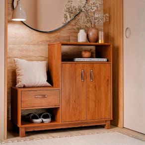 Com estrutura em MDP/MDF de 15mm, oferece 3 portas com dobradiças metálicas, 1 prateleira interna e pés em madeira maciça que garantem resistência e estilo.
