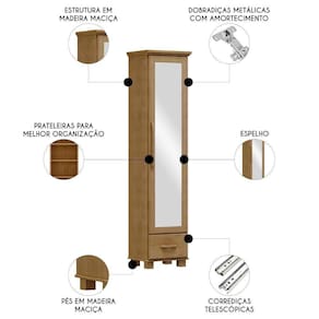 A Sapateira Com Espelho conta com dobradiças metálicas com amortecimento, garantindo um fechamento suave e silencioso. Além de agregar estética, o espelho oferece praticidade no seu dia a dia, tornando o ambiente mais funcional e charmoso.