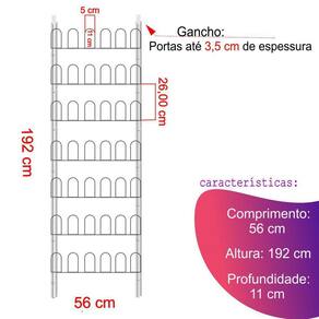- Largura (cm): 56 - Altura (cm): 186 - Profundidade (cm): 11 - Gancho de encaixe para Porta até 3,5 cm de espessura - Gancho com bucha para parede - Material: Aço - Divisórias 42 - Capacidade 21 pares de Calçados