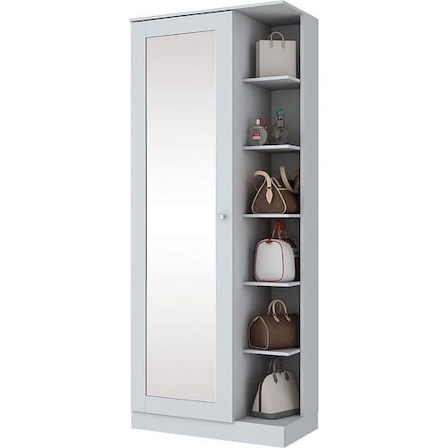 Feita em MDP e MDF a Sapateira Duetto da Henn possui uma porta com espelho, 7 prateleiras internas e 6 prateleiras externas.