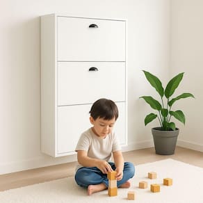 A versatilidade é chave! A Sapateira Slim acompanha tanto pés resistentes em ferro com pintura eletrostática preta (padrão, como os puxadores concha) quanto uma régua de encaixe francês, permitindo que você escolha a instalação que melhor se adapta ao seu espaço: apoiada no chão com um visual mais clássico ou suspensa na parede para um efeito flutuante moderno e ainda mais leveza visual.