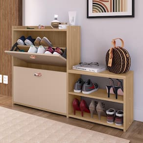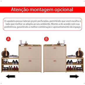 Ela conta com duas gavetas basculante que acomodam até 12 pares de calçados. Também dispõe de um banco lateral com prateleira inclusa, garantindo mais espaço para armazenamento de sapatos ou itens decorativos.