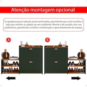 Ela conta com duas gavetas basculante que acomodam até 12 pares de calçados. Também dispõe de um banco lateral com prateleira inclusa, garantindo mais espaço para armazenamento de sapatos ou itens decorativos.