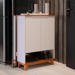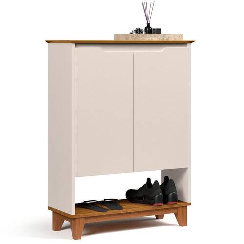 Sapateira Hall Flow Off White Com Freijo Com estilo moderno e linhas suaves, a Sapateira Hall Flow é a escolha ideal para quem deseja manter o ambiente de entrada organizado com elegância e design clean e proporções bem definidas tornam a peça perfeita para compor halls, corredores ou áreas de circulação com sofisticação e leveza tampo e as portas são fabricados em MDF usinado, com acabamento refinado que valoriza os detalhes e reforça a estética contínua e puxadores externos, o visual da frente é uniforme e minimalista, destacando o design contemporâneo do mó estrutura dos pés em madeira maciça proporciona firmeza, durabilidade e um toque natural ao diferencial, o modelo acompanha régua dupla face, um recurso funcional que permite a passagem e organização de cabos ideais para quem deseja utilizar a sapateira também como apoio multifuncional no ambiente.Internamente, oferece amplo espaço para armazenamento de calçados, acessórios ou itens de uso cotidiano, unindo praticidade à estética leve e ões:Altura: 90,5 cmLargura: 68 cmProfundidade: 26,5 cmObservações:- Design sem puxadores aparentes, com visual limpo e contemporâneo - Tampo e portas em MDF usinado, com acabamento sofisticado - Estrutura dos pés em madeira maciça, com excelente resistência - Régua dupla face inclusa: mais organização e versatilidade - Amplo espaço interno para calçados, acessórios e objetos diversos