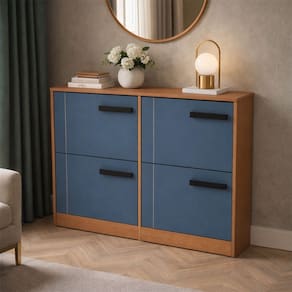 O(a) Sapateira Lisboa 4 Portas Azul/Freijó - Politorno é produzido em MDP na escala de brilho Semi-Fosco, e possui um grau de dificuldade de montagem: Médio.