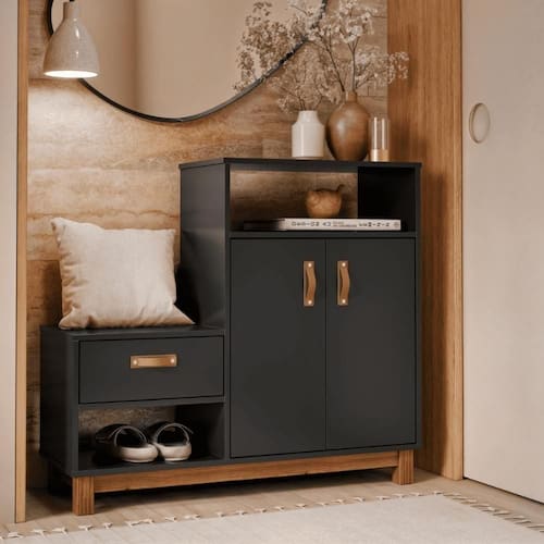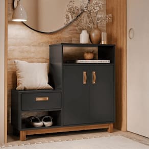 Sapateira Multiuso Omaha Preto Se você busca um móvel que une praticidade, elegância e funcionalidade, a Sapateira com Assento é a escolha perfeita! Dimensões do produto montado: Altura: 90 cm Largura: 100 cm Profundidade: 36 cm Características: - Material MDF/MDP - Cor preto - Prateleira - Porta - Nicho Itens Incluso: 01 Sapateira. Kit completo para montagem. Manual de montagem. Observações: - Não nos responsabilizamos pela montagem do produto. - Sistema de Montagem: Parafusos, Cavilhas e Tampos. - É recomendado que a montagem seja feita por um profissional qualificado. - As imagens indicam uma sugestão de uso e são apenas ilustrativas, os objetos decorativos não estão inclusos. - Ao iniciar a montagem, forre o chão com o papelão das embalagens para proteger as peças de arranhões. Instruções e Cuidados: Limpar com pano seco, manter em lugar livre de umidade, ao abrigo de exposição direta ao sol. QUANTIDADE DE GAVETAS: 1 | GARANTIA DO FABRICANTE: 3 | QUANTIDADES DE CAIXAS DE EMBALAGEM: 1 | COR PREDOMINANTE: PRETO | CORES DO PRODUTO (FILTRO DE CORES): PRETO | DESCRIÃ?Ã?O DO TAMANHO: 90X100X36 | MATERIAL PRINCIPAL: MDF/MDP | ESTADO DE ORIGEM: SP | INSTRUÃ?Ã-ES/CUIDADOS: Limpar com pano macio e seco, nÃo utilizar produtos abrasivos. | PRODUTO PRECISA DE MONTAGEM?: Sim, a montagem à facil mas sugerimos a contrataÃÃo de um montador profissional para a montagem do produto. NÃo nos responsabilizamos por danos causados no ato da montagem. | ALTURA DO PRODUTO (CM): 90 | LARGURA DO PRODUTO (CM): 100 | COMPRIMENTO DO PRODUTO (CM): 36 | PESO DO PRODUTO (KG): 29 | ALTURA DO PRODUTO COM EMBALAGEM (CM): 15 | LARGURA PRODUTO COM EMBALAGEM (CM): 1 | COMPRIMENTO PRODUTO COM EMBALAGEM (CM): 42 | PESO PRODUTO COM EMBALAGEM (KG): 30 | PRODUTO: SAPATEIRA | MARCA: CASAH | QUANTIDADE DE PORTAS: 2 | QUANTIDADE DE NICHOS: 2 | QUANTIDADE DE PRATELEIRAS: 1