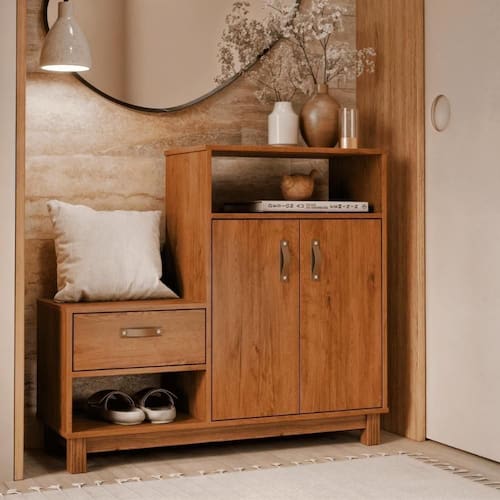 Sapateira Multiuso Utah Freijó Se você busca um móvel que une praticidade, elegância e funcionalidade, a Sapateira com Assento é a escolha perfeita! Dimensões do produto montado: Altura: 90 cm Largura: 100 cm Profundidade: 36 cm Características: - Material MDF/MDP - Cor freijó - Prateleira - Porta - Nicho Itens Incluso: 01 Sapateira. Kit completo para montagem. Manual de montagem. Observações: - Não nos responsabilizamos pela montagem do produto. - Sistema de Montagem: Parafusos, Cavilhas e Tampos. - É recomendado que a montagem seja feita por um profissional qualificado. - As imagens indicam uma sugestão de uso e são apenas ilustrativas, os objetos decorativos não estão inclusos. - Ao iniciar a montagem, forre o chão com o papelão das embalagens para proteger as peças de arranhões. Instruções e Cuidados: Limpar com pano seco, manter em lugar livre de umidade, ao abrigo de exposição direta ao sol. COR PREDOMINANTE: FREIJO | MATERIAL PRINCIPAL: MDF/MDP | CORES DO PRODUTO (FILTRO DE CORES): FREIJO | DESCRIÃ?Ã?O DO TAMANHO: 90X100X36 | INSTRUÃ?Ã-ES/CUIDADOS: Limpar com pano macio e seco, nÃo utilizar produtos abrasivos. | GARANTIA DO FABRICANTE: 3 | QUANTIDADES DE CAIXAS DE EMBALAGEM: 1 | ESTADO DE ORIGEM: SP | PRODUTO PRECISA DE MONTAGEM?: Sim, a montagem à facil mas sugerimos a contrataÃÃo de um montador profissional para a montagem do produto. NÃo nos responsabilizamos por danos causados no ato da montagem. | ALTURA DO PRODUTO (CM): 90 | LARGURA DO PRODUTO (CM): 100 | COMPRIMENTO DO PRODUTO (CM): 36 | PESO DO PRODUTO (KG): 29 | ALTURA DO PRODUTO COM EMBALAGEM (CM): 15 | LARGURA PRODUTO COM EMBALAGEM (CM): 1 | COMPRIMENTO PRODUTO COM EMBALAGEM (CM): 42 | PESO PRODUTO COM EMBALAGEM (KG): 30 | PRODUTO: SAPATEIRA | MARCA: CASAH | QUANTIDADE DE PORTAS: 2 | QUANTIDADE DE NICHOS: 2 | QUANTIDADE DE GAVETAS: 1 | QUANTIDADE DE PRATELEIRAS: 1