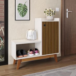 Ela também conta com um assento que possibilita calçar seus sapatos de forma confortável. Abaixo do assento foi inserido um nicho, podendo ser utilizado para acomodar calçados ou itens decorativos.