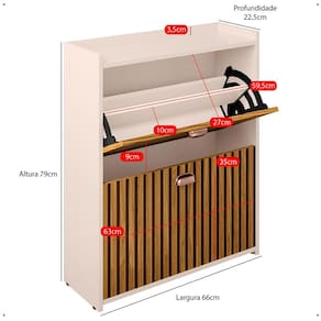 Fabricada em MDP de alta qualidade, oferece resistência e durabilidade. Conta com duas gavetas basculantes com prateleiras, ideais para armazenar até 12 pares de calçados, mantendo tudo organizado e harmonioso.