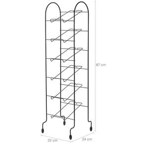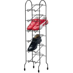 Garantia: 90 dias / Peso: 1,244kg / Cor predominante: preto / Referência: 7896429164439 Dimensões: 22cm (C) x 24cm (L) x 87cm (A); Capacidade: 6 pares de calçados; Conteúdo: 1 sapateira; Material: aço, pintura epóxi e PVC.