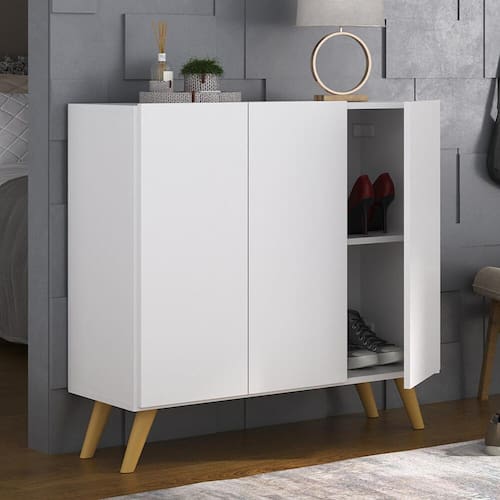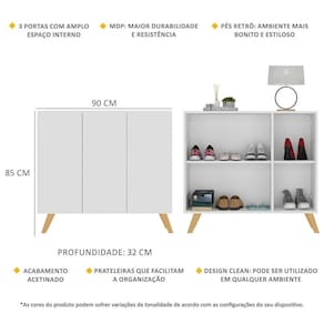 A Sapateira Retrô 3 Portas Nina Multimóveis é produzida em MDP com acabamento acetinado (cerca de 20% de brilho), que garante maior durabilidade, facilidade na limpeza, além de um acabamento superior. Com 3 portas, possui um excelente espaço interno para acomodar seus sapatos e demais pertences (as prateleiras internas suportam 2 e 5 Kg e o tampo 7 Kg). Os pés retrô, em polipropileno, dão um charme especial ao móvel deixando-o com um visual leve e permitindo você compor um ambiente com ar vintage e moderno ao mesmo tempo. Compacta, é uma excelente opção para otimizar seu ambiente, para que você possa aproveitá-lo da melhor maneira possível.